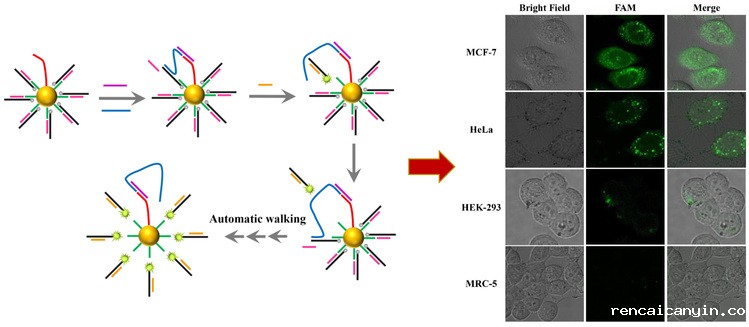 图片说明:DNA纳米机器的工作原理示意图和细胞内特异性miRNA激光共焦显微镜图像
