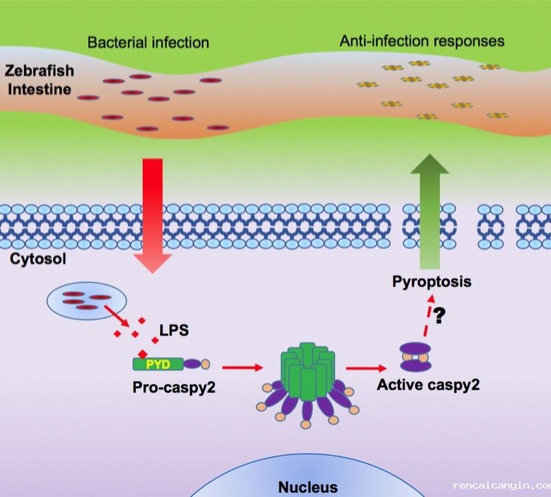 炎症小体(inflammasomes) 是一种由细胞浆内天然免疫识别受体参与组装的多蛋白复合物,其激活在应答危险信号并促进白介素IL-1β和IL-18分泌过程中扮演了重要作用。在哺乳动物中,经典炎症小体和非经典炎症小体分别通过激活caspase-1和caspase-11,触发一种特殊的细胞死亡模式——pyroptosis,进而抵御感染。近年来,不断有研究证实细胞炎性坏死或细胞焦亡是一种机体在感知病原微生物浸染后启动的免疫防御反应,在拮抗和清除病原感染以及内源危险信号中发挥重要作用。但是,在鱼类等低等脊椎动物中是否也存在炎症小体,其如何介导抗感染免疫效应的分子机制仍然是一个具有挑战的课题。