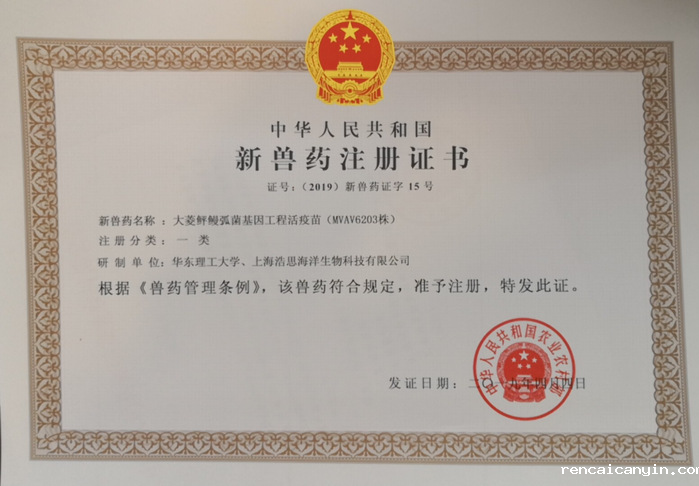 在国家现代农业产业技术体系和海洋公益性项目的多重支持下,张教授课题组与上海浩思海洋生物科技有限公司密切合作,于2014年获批大菱鲆鳗弧菌基因工程活疫苗(MVAV6203株)农业部临床批件,2015-2018年间提交产品注册申报,在国家重点研发计划的加力支持下,陆续通过农业部兽药评审中心初审、技术审查、中监所复核检验等一系列严苛的行政许可审批,终于在20194月获批国家一类新兽药证书。这是我国也是目前国际上首例被行政许可批准的海水鱼类弧菌病基因工程活疫苗,不仅为今后促进开发更多新型水产疫苗提供了可靠的临床技术标准参考与借鉴,也丰富了我国水产疫苗的产品种类,必将为我国以鱼类为代表的现代水产养殖业的绿色健康发展提供核心产业技术与配套产品支撑。接种疫苗取代抗生素等化学药品是不可动摇的产业发展趋势和市场的必然选择,这一药证的获批,是张元兴教授科研团队在我国水产疫苗创新研发领域与产业化进程中实现的又一次零的突破。