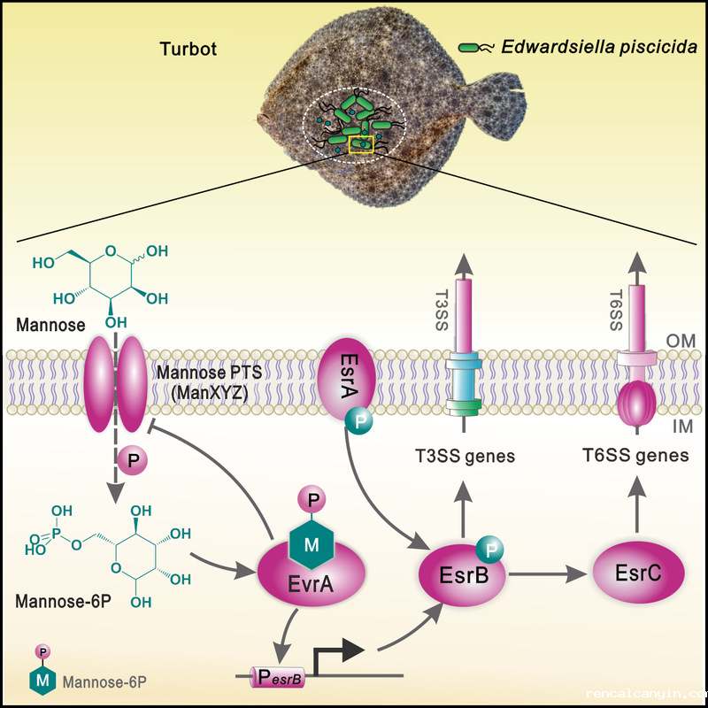 糖代谢是为生物体生长提供能量的的基础代谢之一。病原菌往往一方面利用糖代谢生产ATP,促进生长繁殖;另一方面利用糖代谢过程产生的代谢物作为信号分子,调控代谢过程和毒力系统表达,从而促进感染过程。从杀鱼爱德华氏菌野生毒株出发,本论文首先利用mariner家族转座子构建了一个插入位点确定的杀鱼爱德华氏菌突变株文库(Defined transposon insertion mutant library)。利用该文库和转座子插入测序技术在不同培养基、巨噬细胞以及大菱鲆条件下对生长/定植相关的条件必需基因进行系统筛选,发现在该菌中甘露糖代谢显著影响其在鱼体内的定植。本论文进一步研究发现,爱德华氏菌通过其编码的甘露糖PTS (磷酸烯醇式丙酮酸转移酶)系统,感知环境中存在的甘露糖,并将其磷酸化生成甘露糖-6磷酸,并转运至胞内(图1)。体内的一种新型转录调控因子EvrA能直接与甘露糖-6磷酸结合并受其调控,增强与DNA结合能力,激活由EsrB和EsrC介导的三型分泌系统(T3SS)和六型分泌系统(T6SS)的表达,进而调控杀鱼爱德华氏菌在宿主体内的定植过程,并造成系统性感染(图1)。该研究首次报道病原菌通过感知环境中的甘露糖调控毒力系统表达,为水产养殖病害防控技术开发提供理论指导。