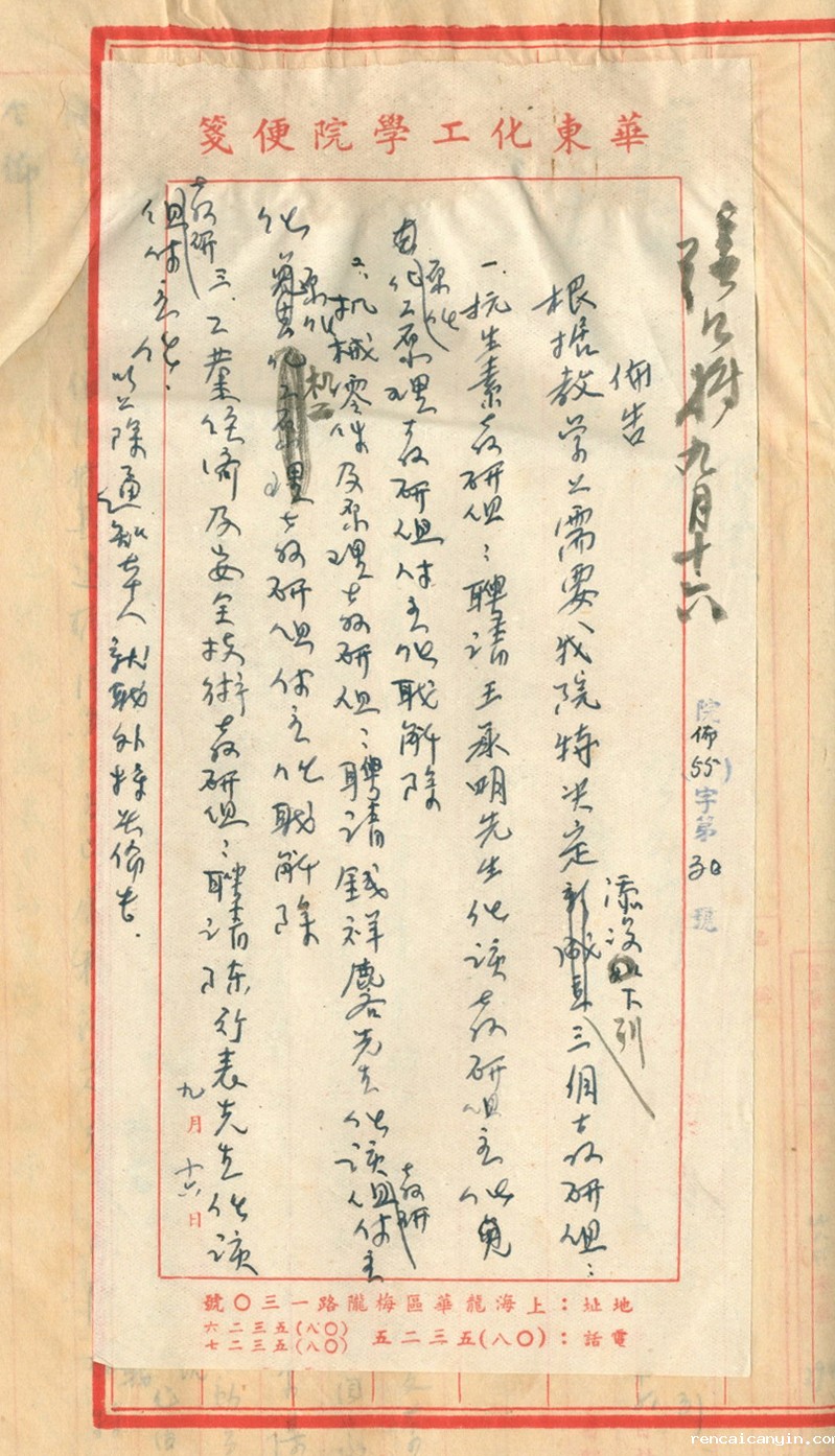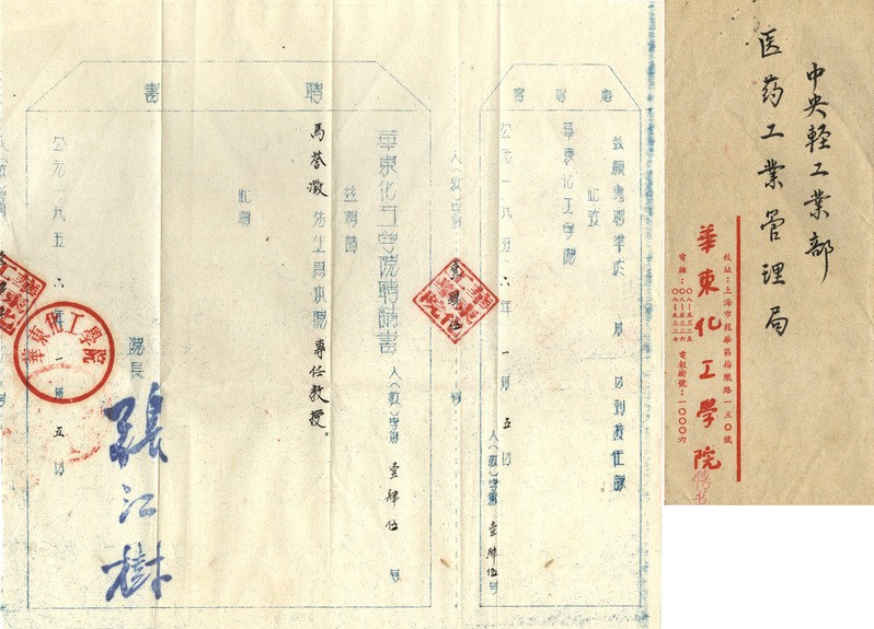 19560105华东化工学院张江树院长签发的聘马誉澂为学校专任教授的聘书