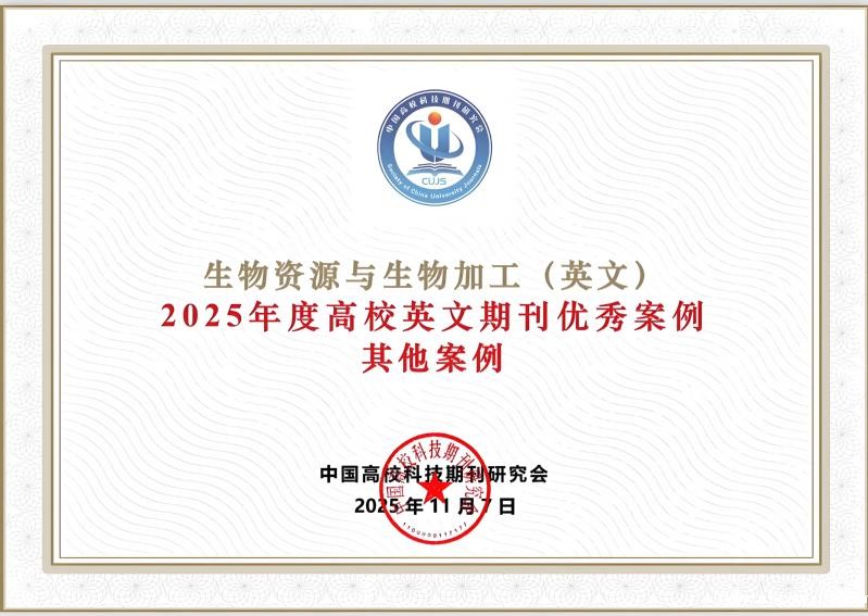 与此同时,在11月6日至9日于陕西西安举办的中国高校科技期刊研究会上,BIOB成功入选“2025年度高校英文期刊优秀案例”。该评选旨在表彰在促进中国学术“走出去”、提升国际学术话语权方面表现突出的高校英文期刊。BIOB的入选,体现了其在坚持高水平、国际化办刊方向,积极服务全球生物资源与生物加工领域学术共同体所取得的成效。