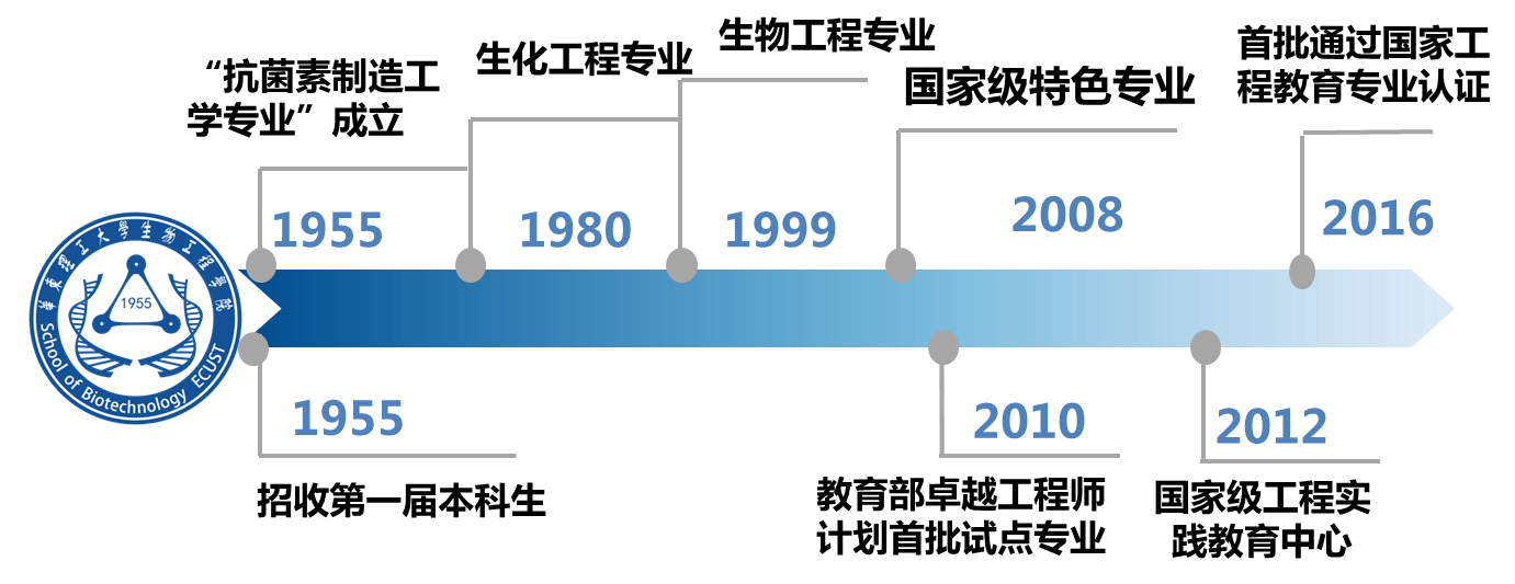 生物工程是利用生物学与工程学相结合的方法,按照人类的需要设计和改造生物的结构与功能,以便绿色、高效、经济地制造各种产品的新型学科,是生命科学从实验室研究通向工业生产的桥梁。华东理工大学生物工程专业是国家特色专业,其办学历史起源于1955年创建的“抗生素制造工学专业”,为我国化工、医药、食品等领域培养了一大批科学、工程和技术人员。随着学科的发展(如图),生物工程专业在基因工程、生物催化工程、药物开发、动植物细胞培养、发酵工程、生物产品分离纯化、生物制药工程等领域形成了科研教育相融合、理论与工程相结合的办学特色。2016年生物工程专业首批通过教育部国际工程教育标准认证(全国唯二),生物工程教育获得国际认可,显著提高学生的国际竞争力。